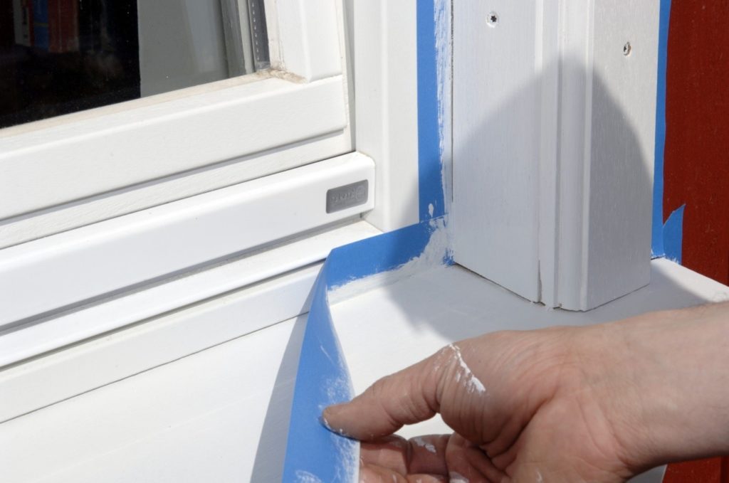 - Покройте раму и откосы малярным скотчем, оставив по 1-2 мм от основания их поверхности. Прорезанные места сразу покрывайте грунтовкой.