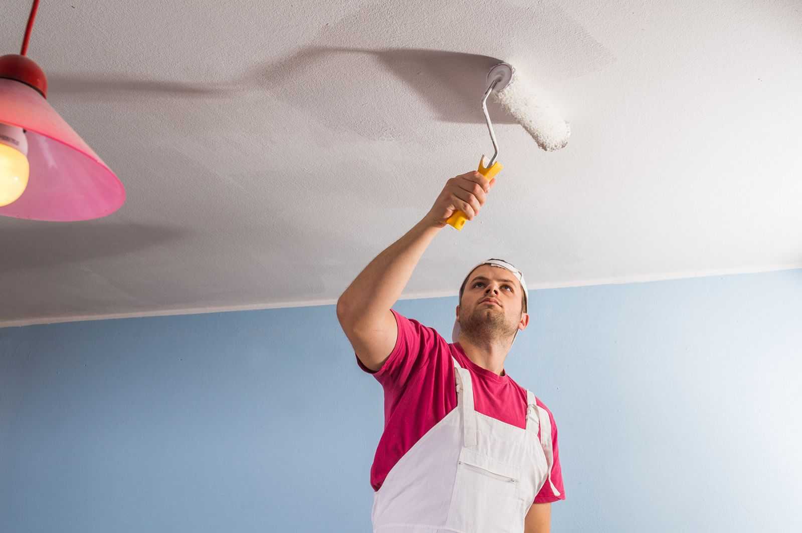 - Окрашивают потолок. Для обработки больших участков используют валик, труднодоступных мест – кисть. Время высыхания каждого слоя зависит от типа краски.
