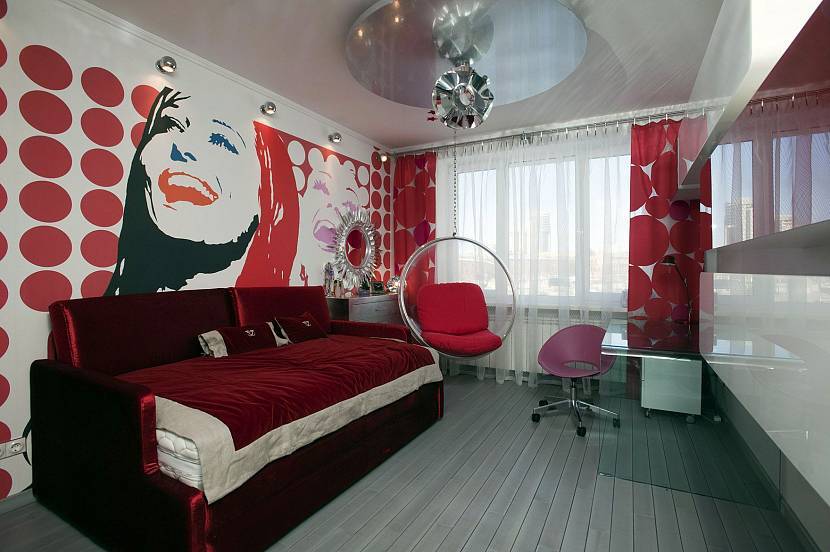 Спальня в стиле поп-арт с красно-белыми шторамиИсточник tomdom.ru