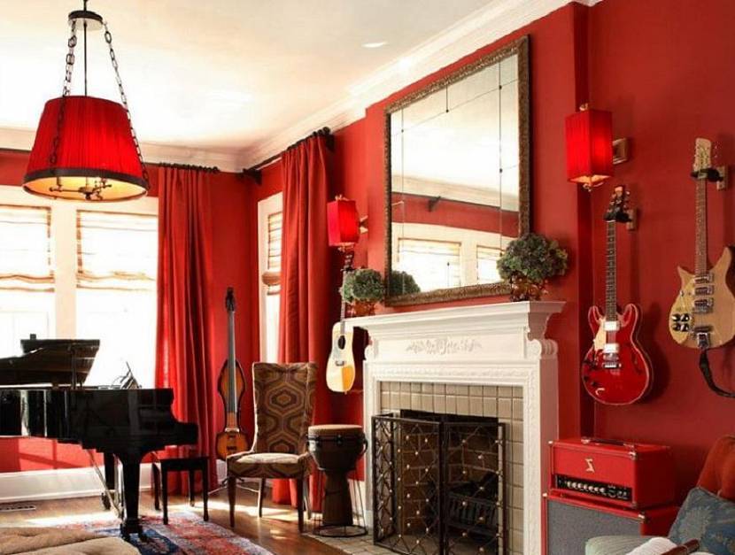 Красные шторы без драпировки в гостиной музыканта хорошо дополняются красными стенами и музыкальными инструментамиИсточник tomdom.ru