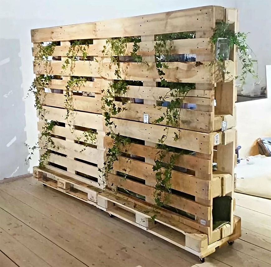 Декоративная стенка позволяет зонировать территорию. Например, с ее помощью можно отделить зону отдыха от обеденной зоны. Такая стенка не должна быть высокой. Поддоны после установки следует украсить.