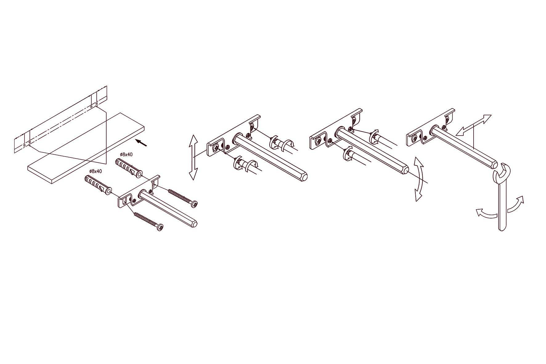 Такие стержни представляют собой штыри, у которых есть резьба с одной стороны и гладкая поверхность с другой. Резьбой каждый штырь закручивается в стену, а гладкая сторона вводится в полку.