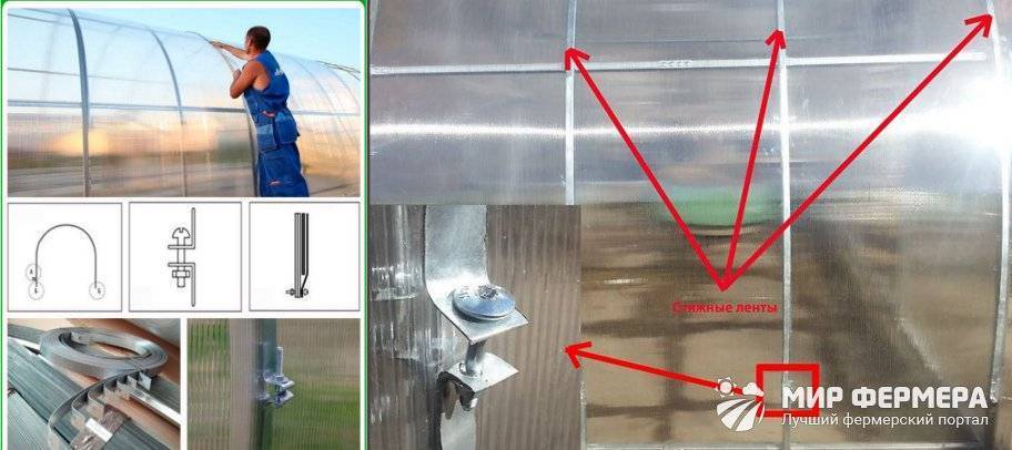 Но, несмотря на определенные недостатки, монтаж листов с помощью такой ленты пользуется высоким спросом. Чтобы закрепить материал, ленту просто перебрасывают через теплицу и закрепляют у основания с двух сторон. Далее продольные части ленты нужно скрепить между собой небольшими поперечными кусками той же ленты.