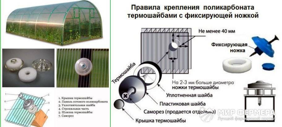 Термошайбы используются для монтажа сотового поликарбоната к металлу. Наружный диаметр у термошайбы должен составлять 40 мм. Сама шайба состоит из таких частей, как защитный колпачок, корпус и силиконовая прокладка. Самый долгий срок службы для монтажа поликарбоната у поликарбонатных шайб.