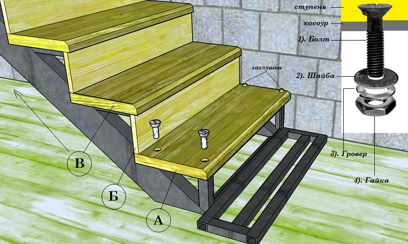 Начнем с нижнего лестничного марша сначала установим нижнюю фризовую ступень (А) крепим ее к косоуру с помощью четырех болтов, например, с потайной головкой и устанавливаем деревянные заглушки. После устанавливаем подступенок (Б) и вторую ступень (В), так же крепим ступень к косоуру. В таком же порядке подступенок — ступень продолжаем установку ступеней на всей лестнице.