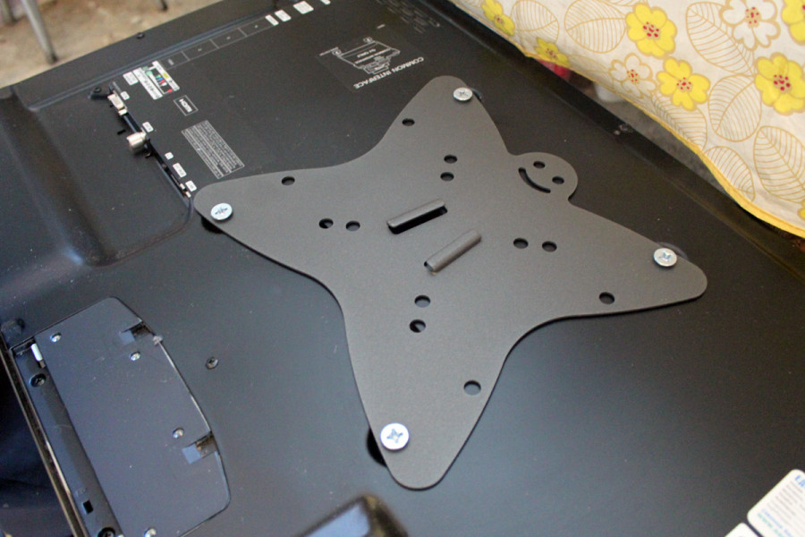 Завершающий этап — крепим ответную часть кронштейна на заднюю стенку телевизора с помощью болтов, идущих в комплекте с кронштейном. Но сначала следует снять ножку телевизора.