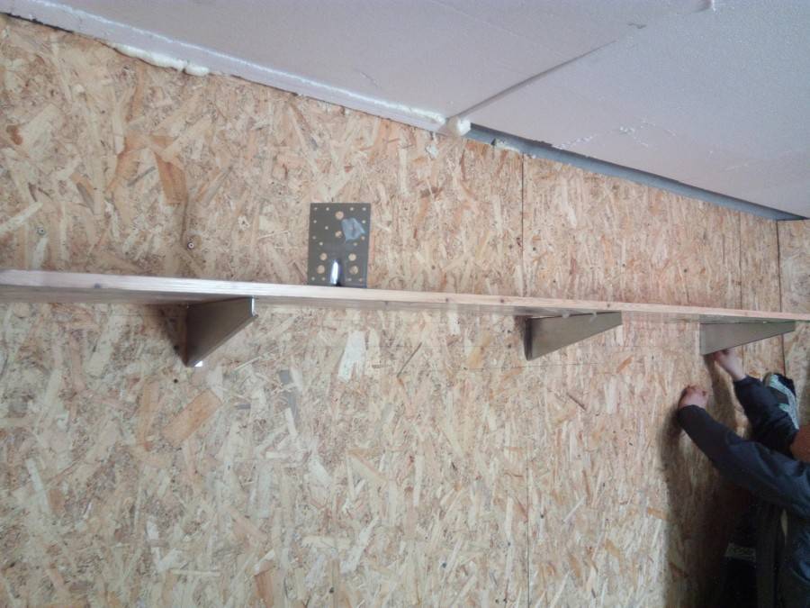 Предварительно измерьте расстояние между будущими дырками, чтобы детали можно было прикрепить друг к другу.Прикрутите саморезами «шину» к бруску.После этого привинтите брусок с «шиной» к стене.Вначале отметьте, где будут располагаться дырки. Используйте строительный уровень, чтобы поставить каркас ровно.Просверлите отверстия в стене и вбейте в них дюбели.Просверлите дырки в бруске.Привинтите брусок к стене, вкрутив саморезы в дюбели. Используйте шуруповёрт.