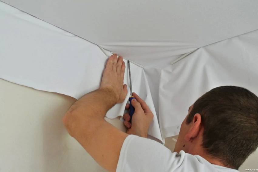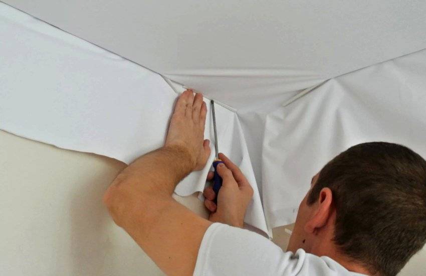 Чтобы натяжной потолок получился достаточно ровным, размер винилового полотна должен быть на десять – пятнадцать сантиметров меньше, чем потолок, который вы хотите получить в итоге. Это нужно потому, что при нагревании полотнища тепловой пушкой оно достаточно расшириться, а когда вы натянете потолок со всех сторон и дадите ему остыть до комнатной температуры, все неровности пропадут, но если полотно, которое и так было достаточного размера расшириться, морщин не избежать. После того как потолок натянется и будет установлен багет, может возникнуть проблема с торчащим полотном. Лишние куски полотнища, выглядывающие из багета, можно просто обрезать обычным строительным ножом.