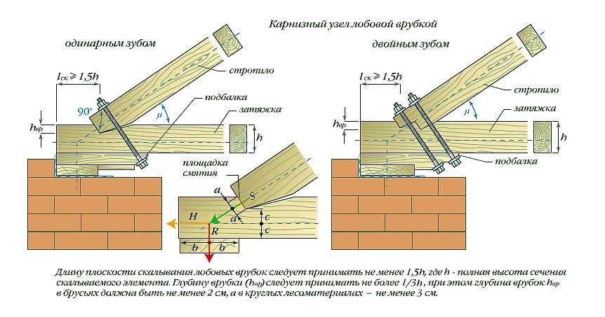 В случае полой крыши, угол наклона которой меньше 35°, стропильные ноги устанавливают так, чтобы опорная площадь на балку увеличилась. Для этого пользуются врубкой двумя зубами: