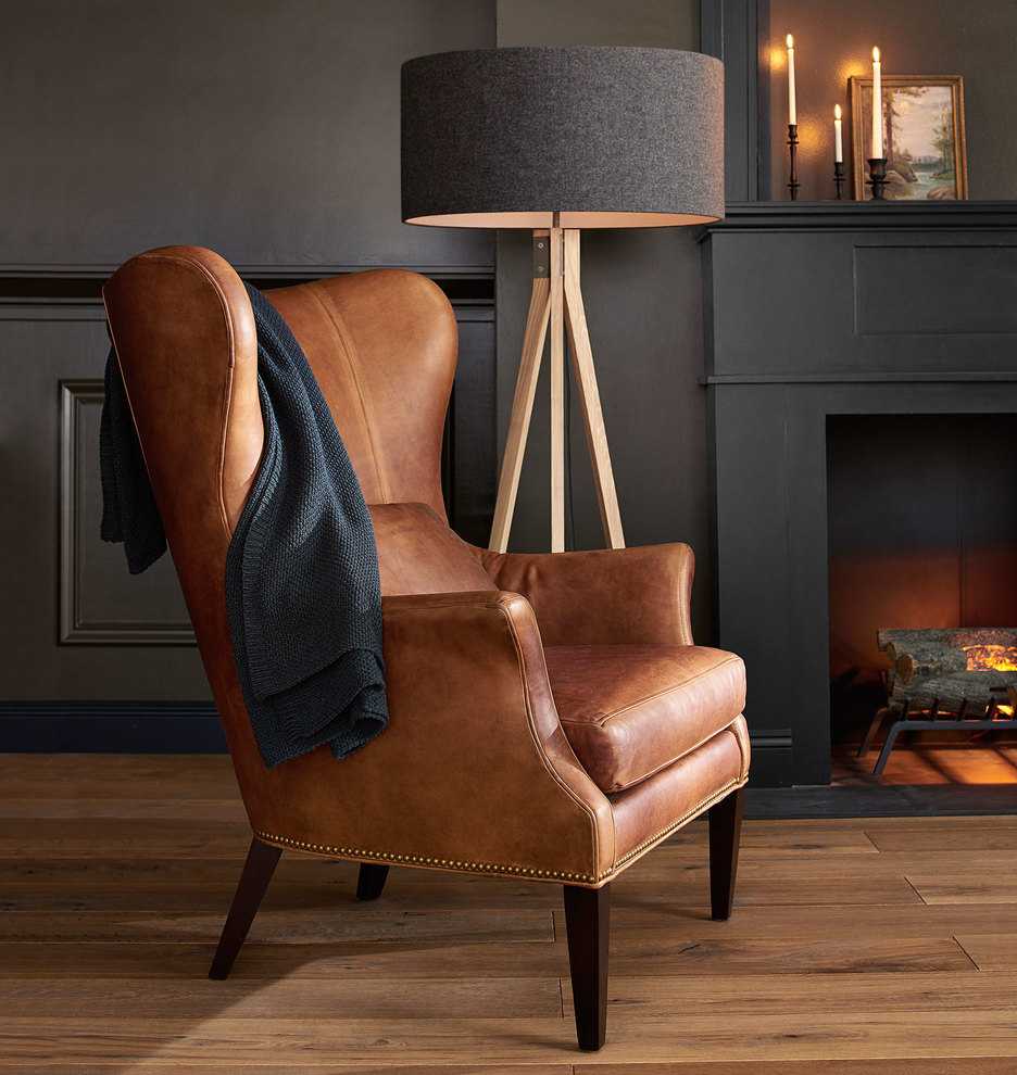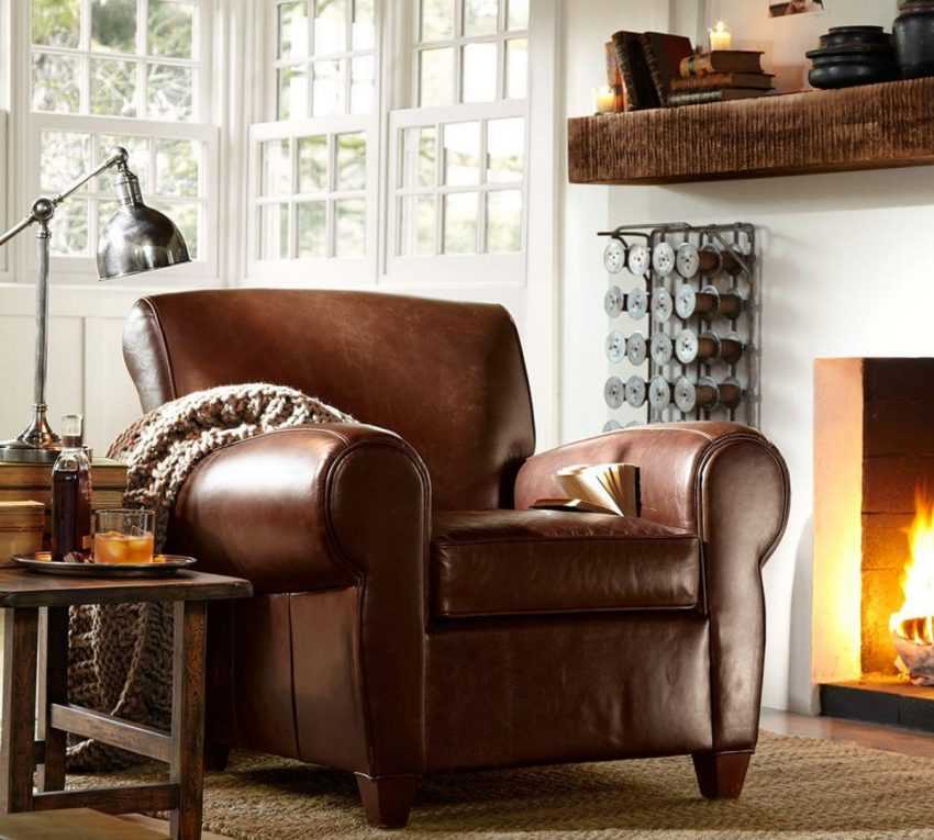 - натуральная кожа — дорогой материал, делающая интерьер более роскошным. Высокая цена натуральной кожи, пожалуй, единственный её недостаток. Достоинств у материала намного больше: высокая прочность, экологичность, гипоаллергенность. Кожаная мебель легко чистится, но требует тщательного регулярного ухода с использованием специальных средств. Необходимо следить за уровнем влажности, чтобы обивка не растрескалась от сухости. Цветовая гамма кожаной мебели чаще всего неброская, это разные оттенки коричневого, серый, белый, чёрный цвета. Кожаные кресла отлично подходят для классических стилей интерьера;