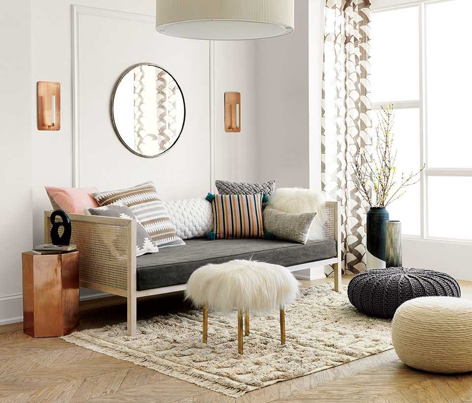 Выбор пуфика зависит от пола комнаты. Для коврового покрытия подходит мебель на роликах. Ламинат не выдерживает механических нагрузок, поэтому на него выгоднее ставить пуф с плоским дном без ножек. На кафельный пол можно ставить всё, кроме изделий с коваными ножками.
