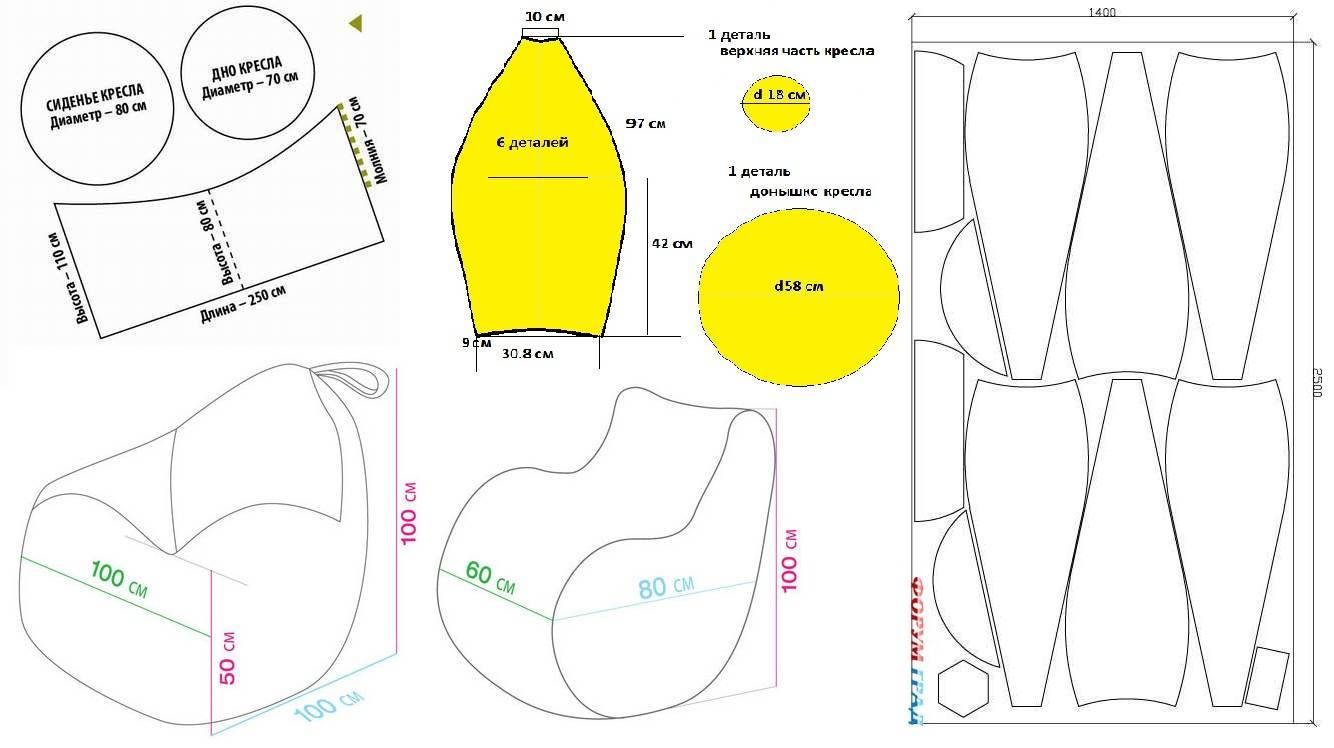Для того, чтобы сшить кресло-мешок, нужно сделать выкройку исходя из желаемых размеров и формы. Получаем четыре детали для чехлов, внутренних и внешних.