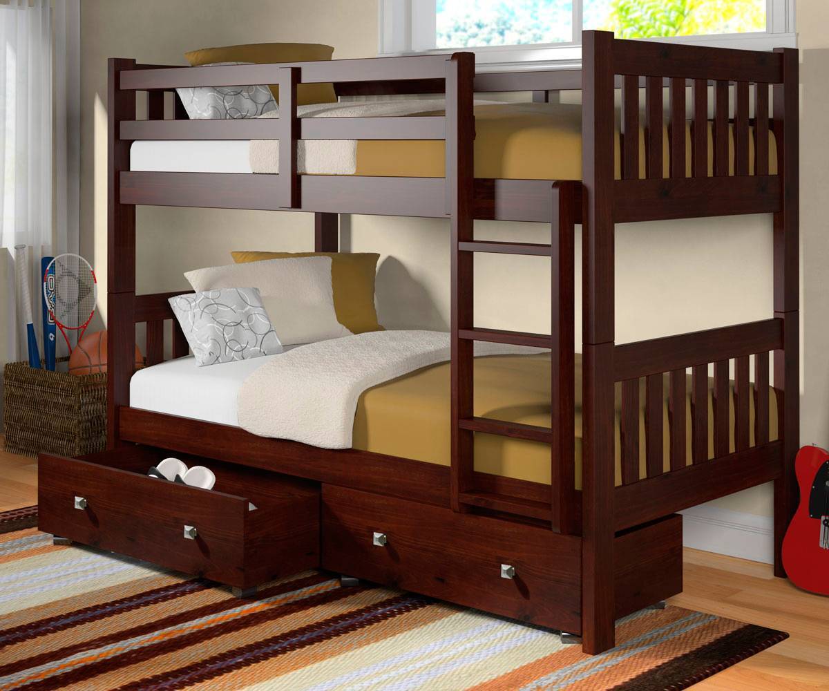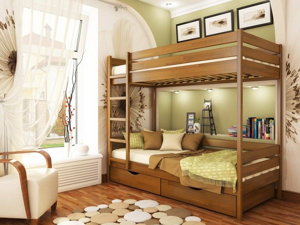 Деревянные модели выглядят респектабельно, эстетически привлекательны и безопасны. Изделие из древесины будет служить долгие годы, не утрачивая потребительских качеств. Красивый натуральный цвет, ярко выраженная фактура и экологическая безопасность – основные преимущества. Но есть и недостатки в виде очень высокой стоимости и тяжести конструкции. Так, для оборудования 2-спального места с рабочей зоной не подойдут слабые межэтажные перекрытия.