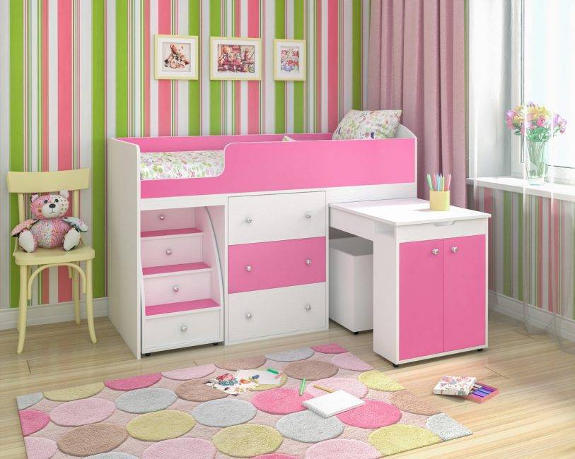 А вот тоже нежный вариант кровати-тумбы с рабочим столом для девочек.