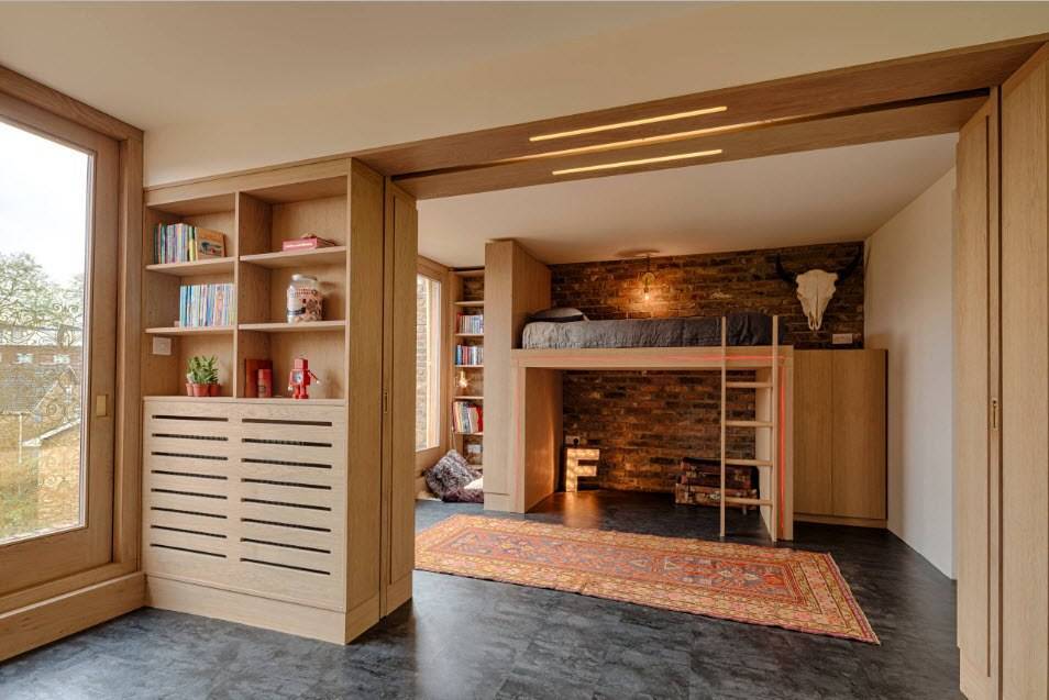 Или можно за лестницей кровати-тумбы не делать стеллажа или зашивки – а оставить там пустую нишу, куда удобно кидать рюкзаки с коньками, скейтборды и прочие громоздкие атрибуты счастливой детской жизни.