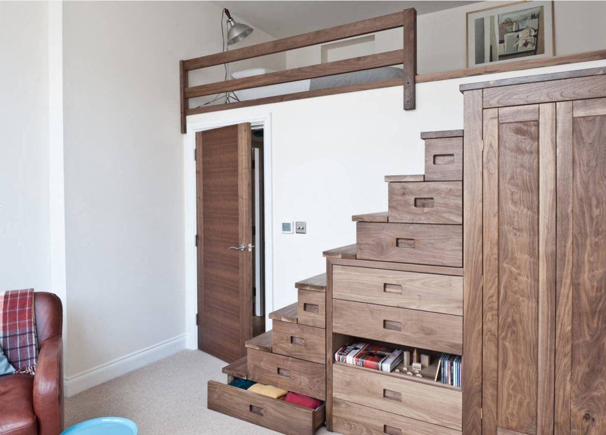 - большое количество полок позволяет найти для каждой вещи свое место; даже лесенка для подъема на второй «этаж» может представлять из себя целую систему хранения;