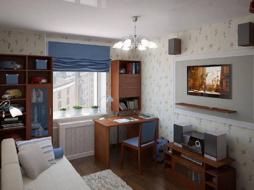 Для мальчика постарше можно подготовить и интерьер построже. Здесь уже может стоять диван, который будет выглядеть массивнее кровати. Вместо занавесок используют жалюзи. Обязательно наличие шкафа, письменного стола, книжных полок, стула-кресла на роликовых опорах. Декорировать можно все любыми тематическими картинками.