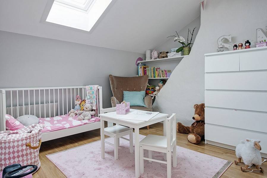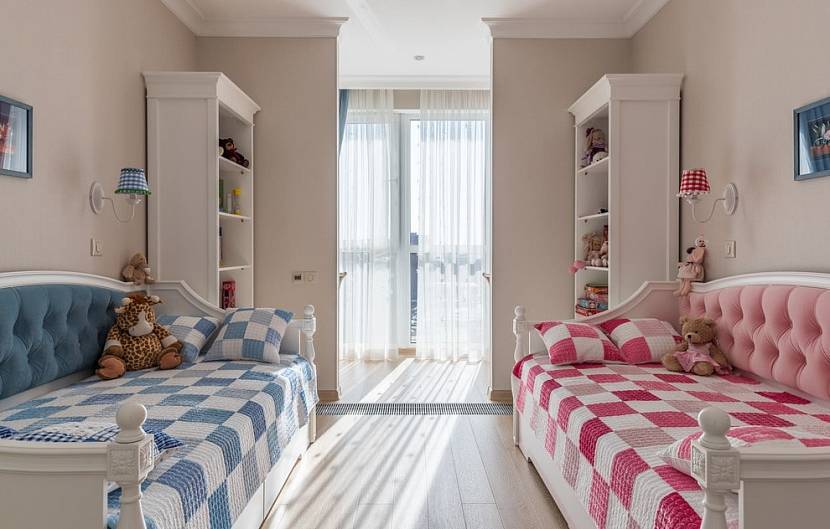 Такое пространство имеет свои особенности. Если разница в возрасте девочек небольшая, у них общие интересы. В этом случае спальных мест нужно два, а шкаф для вещей они могут делить один на двоих, так же как и игровую зону.