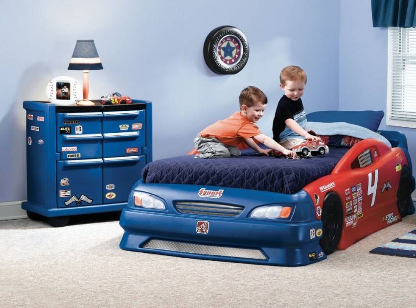 Кровать для мальчика от 3-5 лет может быть выполнена в форме машинки. Если родители при выборе прислушиваются к мнению ребенка – они могут выбрать модель в виде любимого персонажа мультфильма или в форме звездолета. Обязательное условие – наличие у кроватки бортиков. Таким образом ваш малыш не упадет во время сна.