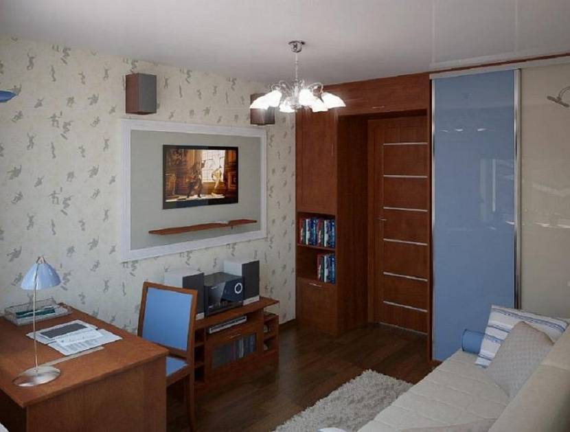 Для помещений периметром 3х4 подходит вариант, где спальное место организовано вдоль одной стены, спортивный «уголок» практически напротив двери, а шкаф напротив кровати.