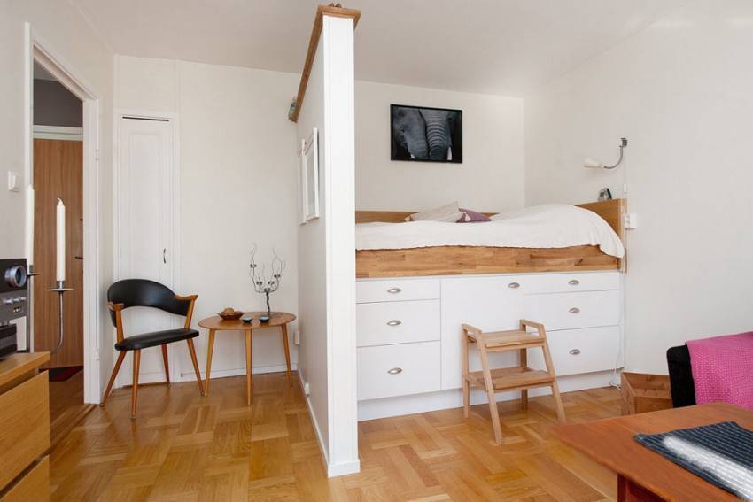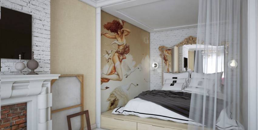 Разместить в нише подиум – кровать – оригинальное решение, создающее дополнительный уют в алькове. В результате: