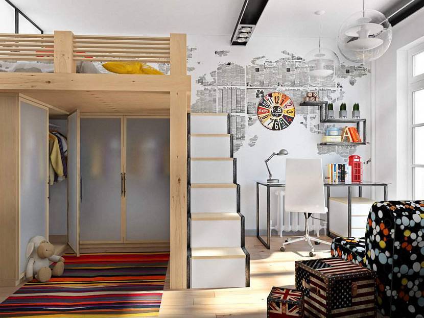 Используется домашний турник, двухуровневое спальное место, шкаф и угловой письменный столИсточник me-house.ru