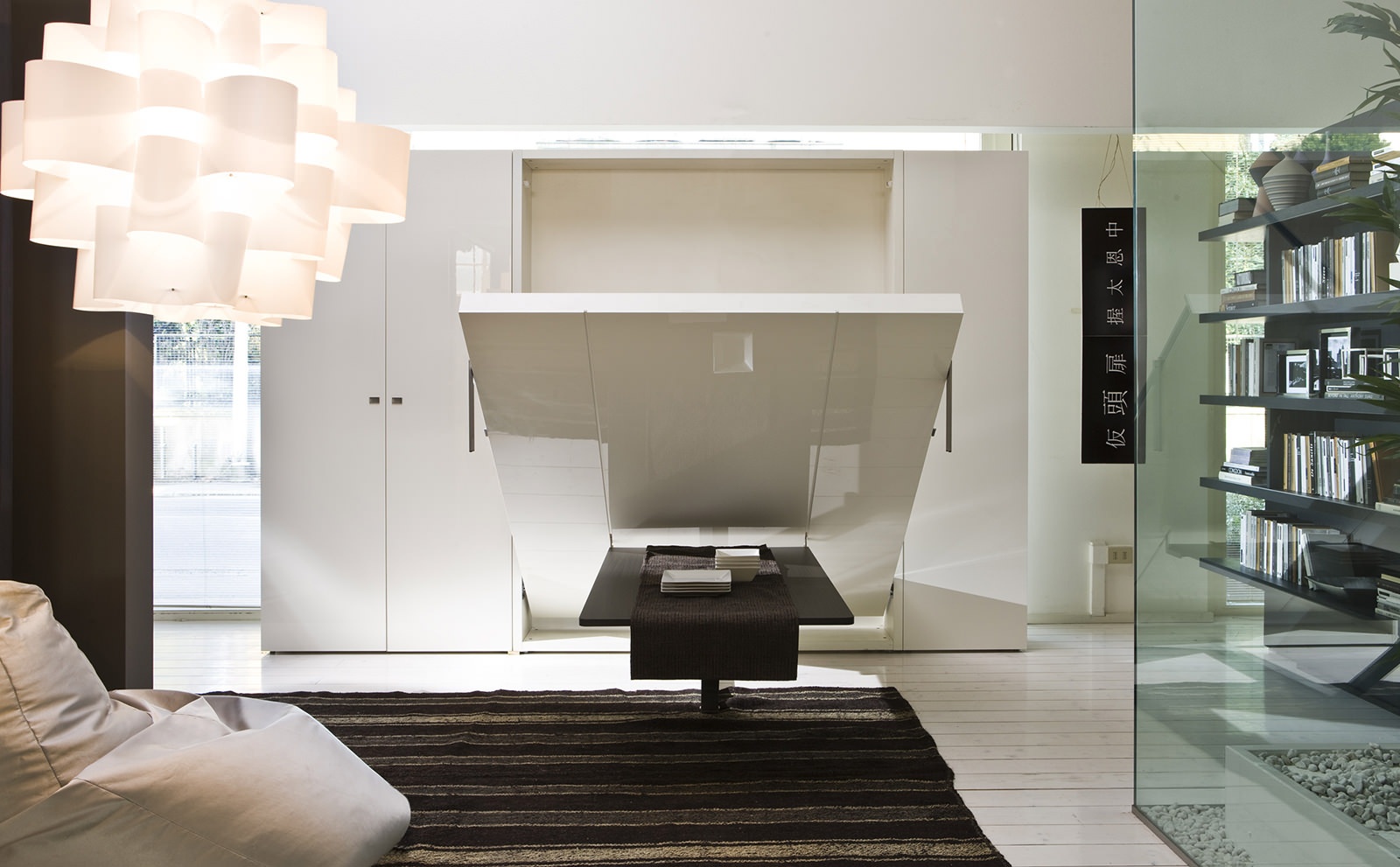 - Американская фирма Resource Furniture разработала концепцию пространственного решения, которое стало своеобразным и очень удобным ноу-хау: один предмет, занимающий в помещении минимальное пространство, может выполнять роль кровати с полками, а также рабочего, обеденного и даже журнального стола.