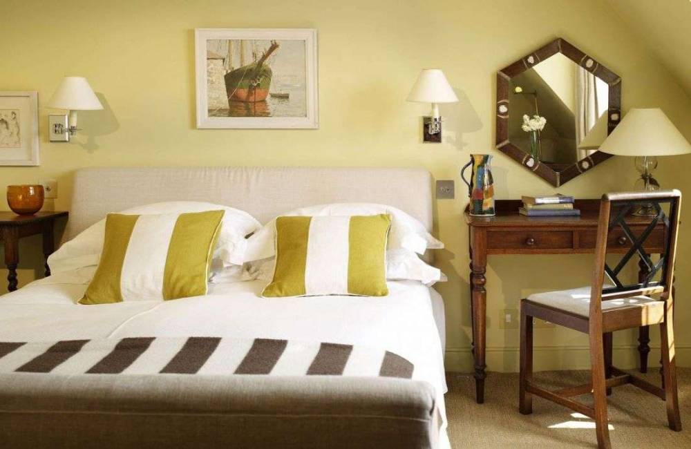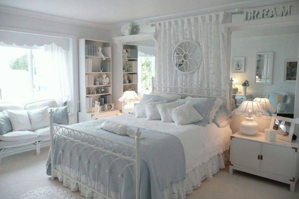 Этот вариант дизайна маленькой спальни родом из Франции. Для него характерны пастельные оттенки, простая, невычурная мебель, цветочные принты.