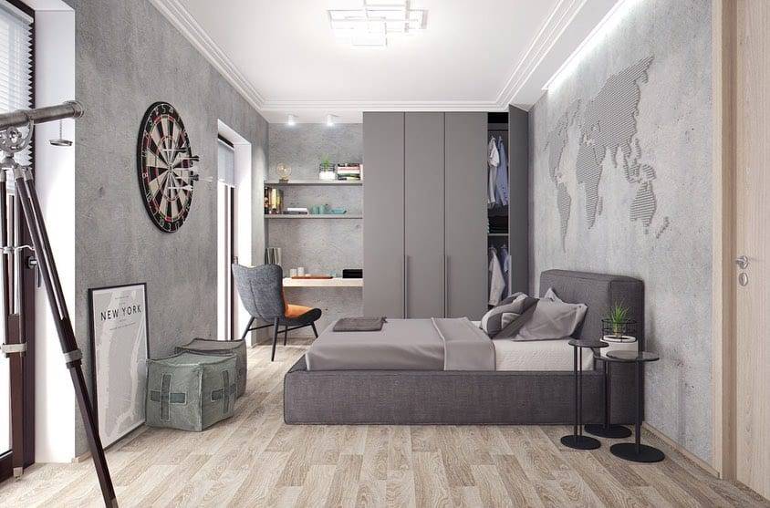 Отличительные черты – чёткость линий, естественные цвета, стремление к минимализму. Мебель – надёжная, аккуратных форм с минимумом декоративных деталей. Однотонные стены и потолок. Серая, бежевая и белая цветовая палитра.