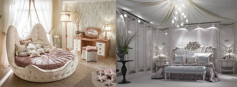 - Достаточно интересно в интерьере спальни смотрится круглая кровать. Диаметр такой кровати обычно не менее 200 см, однако, для сна двоих человек она не очень комфортна, кроме того, занимает достаточно много места. Подбор постельного белья и аксессуаров по форме также может вызвать сложность.