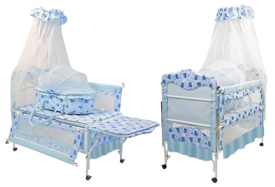 Существует масса моделей такой мебели, отличающихся друг от друга функциональностью и дизайном. В зависимости от комплектации, детские кроватки состоят из различных модулей — столикам, комодами, съемными люльками. В некоторых конструкциях столик для пеленания служит опорной конструкцией кроватки, в других предусмотрена возможность трансформировать комод в тумбочки.