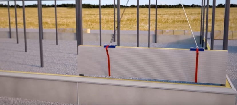 Когда подъемный механизм доставит панель к месту монтажа, с его нижней стороны надо удалить защитную пленку. Это можно сделать со всей поверхности или только в той части плиты, где будет соединение и крепление. Для подъема и подачи плиты используются 2 захвата, а не 1, даже, если сэндвич панель короткая. Это гарантирует ровную подгонку без перекосов.