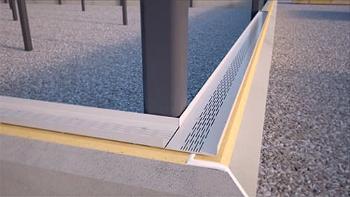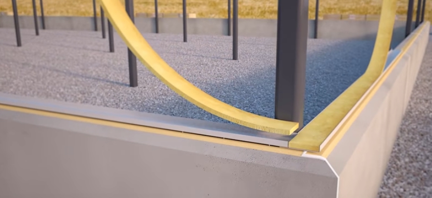 ![]() | Сверху на бутиловую укладывается уплотнительная лента, обеспечивая соприкосновение с колонами. Края следует соединять встык. В углах уплотнительную ленту следует подрезать таким образом, чтобы до края стены оставалось по 50 мм для обеспечения достаточного уклона цокольной направляющей |