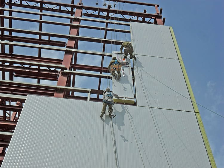 Технология вертикального монтажа сэндвич-панелей практически аналогична инструкции для горизонтальной установки. При выполнении монтажных работ следует добиться плотного прилегания сопрягаемых элементов, что в ряде случаев вызывает серьёзные трудности из-за большого веса и габаритов панелей.