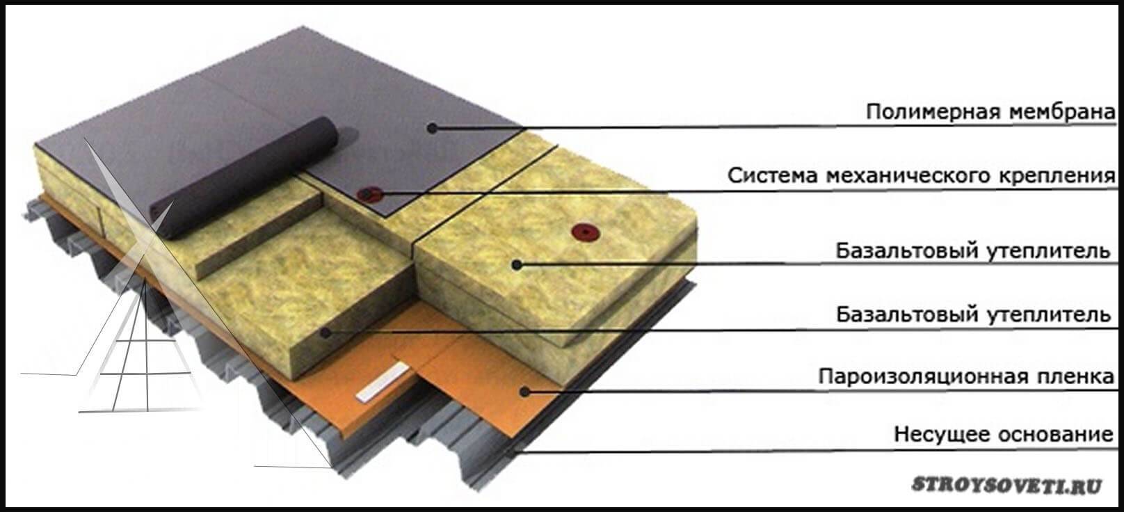 Главным элементом плоской кровли является прочное основание: железобетонные плиты, профнастил или сплошная поверхность из досок, фанеры, ОСП, ЦСП (при оборудовании кровли по деревянным балкам). Само же покрытие кровли выполняется из нескольких слоев. Их количество, место расположения в конструкции и материалы изготовления зависят от назначения кровли и ее типа.