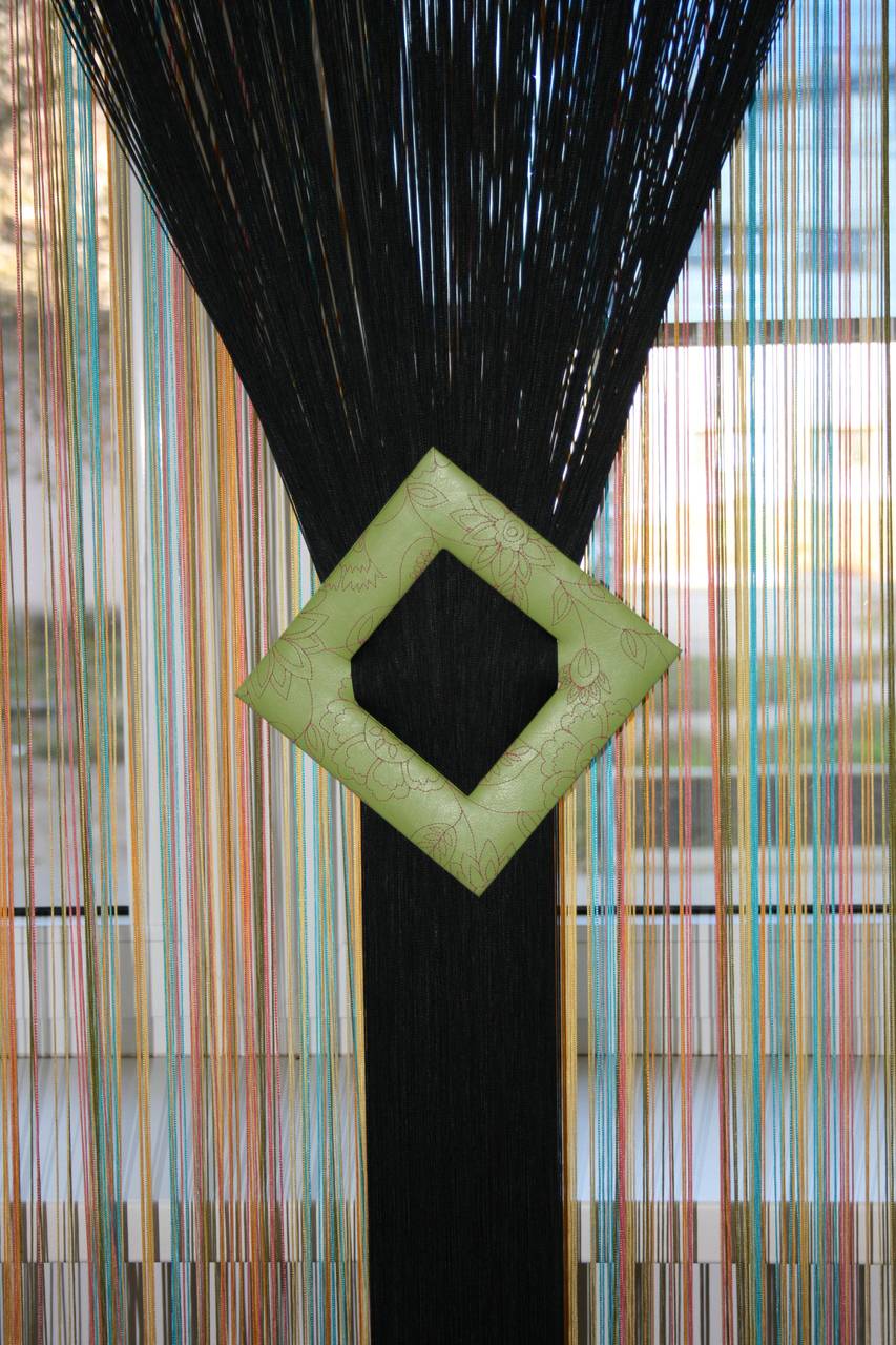 Для фиксации одной занавески подходит завязка, расположенная посередине. Если штора имеет нейтральные оттенки, то подвязка может быть декорирована камнями и другими украшениями. Если на ткани есть узор, то цвет держателя должен повторять оттенок основного фона или расцветки орнамента.