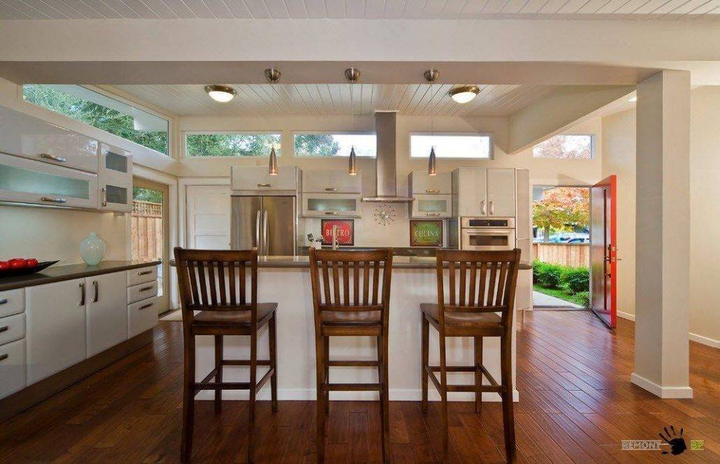 Добавить помещению света и воздуха позволит ленточное остекление. Обычно такой вариант используют в кухнях. Дополнительным бонусом в данном случае станет возможность любоваться прекрасными пейзажами во время приготовления пищи или мытья посуды.