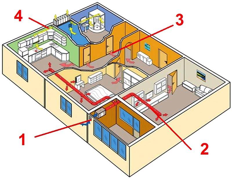 - Из жилой зоны воздушный поток (3) может поступать в санузел, ванную, кухню, но не в обратном направлении.