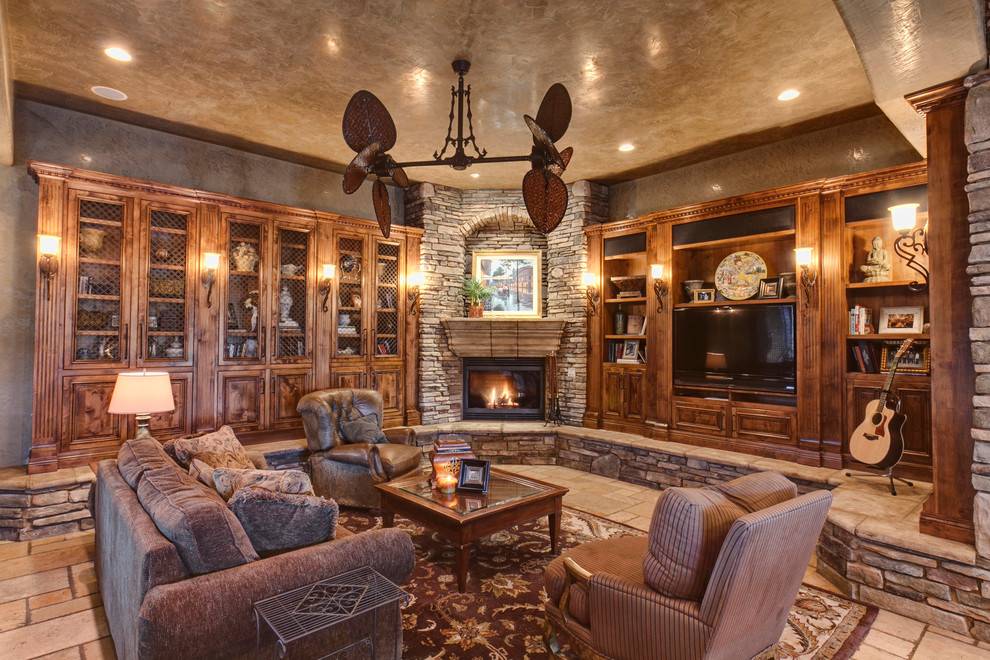 Угловой камин в интерьере гостиной стиля рустик