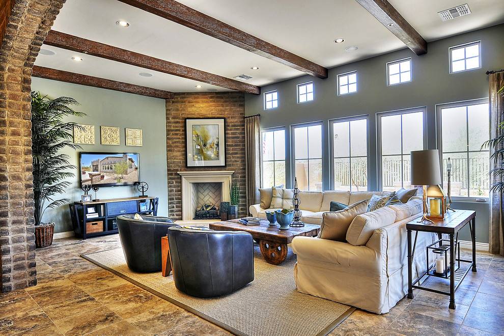Хотя камин контрастирует с остальной частью комнаты, в целом интерьер выглядит гармонично.