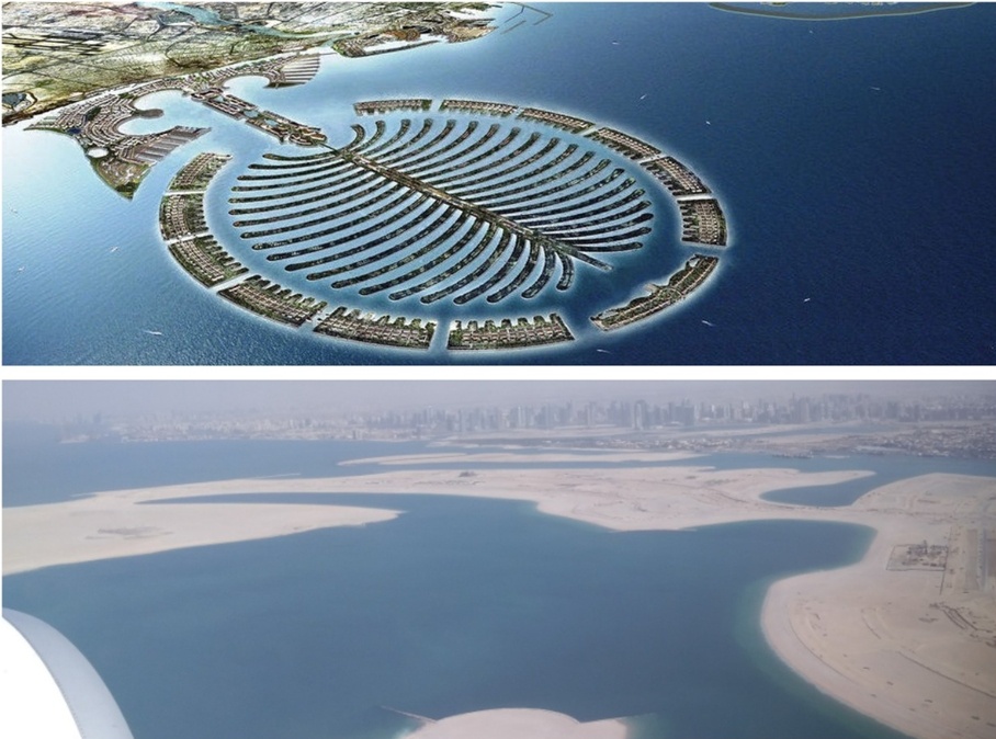 Самый большой искусственный остров в Персидском заливе по праву считается одним из самых амбициозных проектов XXI века. Его общая площадь должна была составлять 42 миллиона квадратных метров. Компания Nakheel начала строительство острова в форме огромной пальмы в 2004 году, но в 2007 году в Персидском заливе сильно повысился уровень воды, и запланированная площадь острова уменьшилась более чем в два раза: с 42 до 18 миллионов квадратных метров. К тому же кризис 2008 года сильно скорректировал их планы не в лучшую сторону. Прошло уже 17 лет, но конца строительства на горизонте не видно. По оценкам экспертов, чтобы достроить Пальму Дейра нужно 10 миллиардов долларов. Вот как выглядят ожидание и реальность.