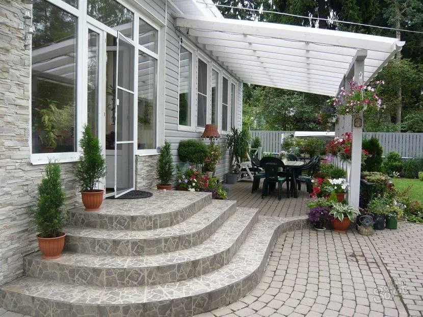 - Приветствуется взятие за основу оформления крыльца общих черт ландшафтного дизайна придомовой территории. Это может быть кладка тротуарной плитки, обшивка перилл или формирование навеса.