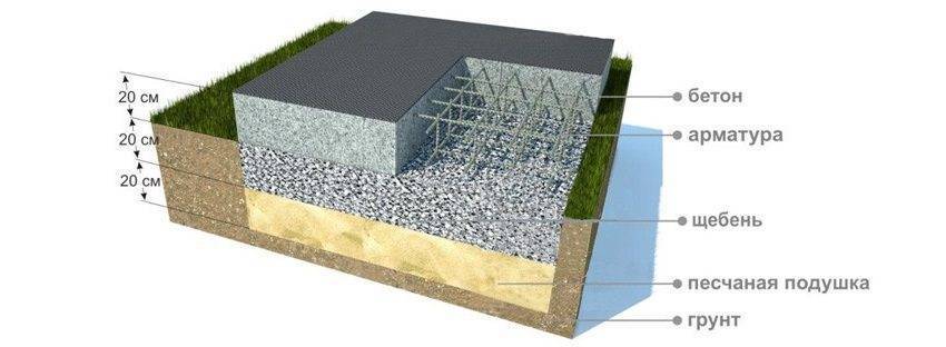 - плитный – монолитная плита из армированного бетона не нуждается в привязке к фундаменту дома и подходит для возведения тяжелых конструкций;