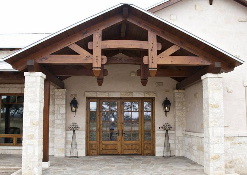 Для такого объекта обычно изготавливается широкая площадка и массивный деревянный каркас для навеса. Крыша мини-террасы удерживается на мощных квадратных колоннах. Они облицованы в светлый декоративный камень. Визуально, кажется, что потолок козырька находится в подвешенном состоянии.