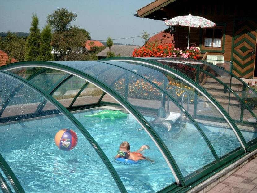 Что касается навесов и крыш для бассейнов, то подходят прозрачные материалы или бирюзовые оттенки. Первые отлично пропускают свет, что позволяет прогревать воду, используя естественные источники тепла, а вторые придают воде красивый морской цвет.