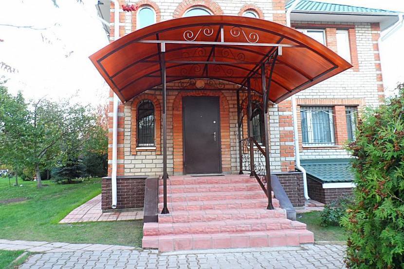 Из листов поликарбоната можно выполнить круглый, арочный, полуарочный, консольный вид навеса, а также прямой козырек с односкатной или двускатной закрытой кровлей.