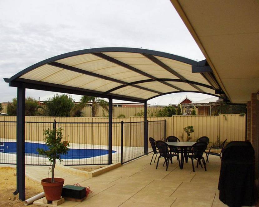 - Полукруглая крыша. Такой вариант появился благодаря использованию поликарбоната. Каркас представляет из себя полукруглые дуги, которые крепятся к основанию беседки. Дуги обшиваются листами поликарбоната.