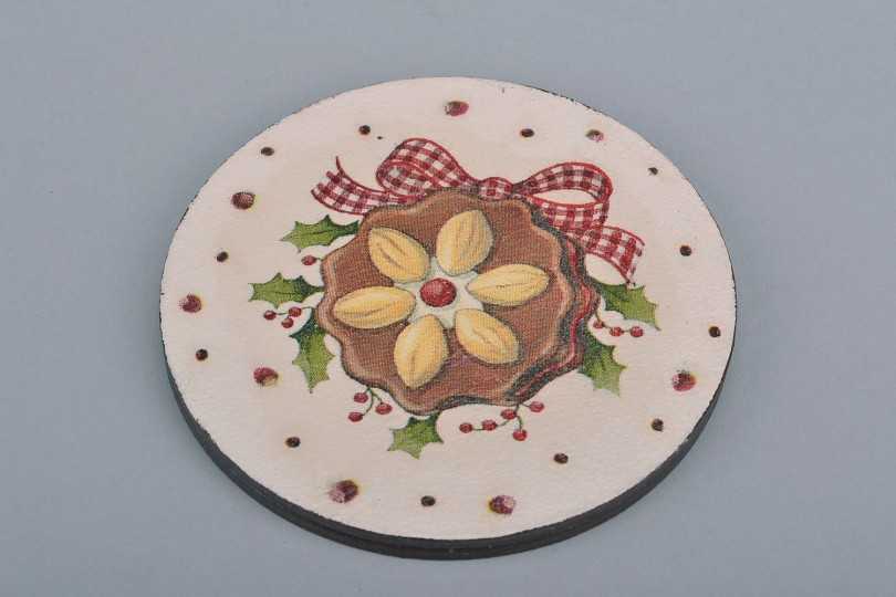 - С обратной стороны в центре приклейте плоский магнит. Он обязательно станет прекрасным подарком ручной работы, который будет радовать глаз друзей и близких, а также украшать кухню.