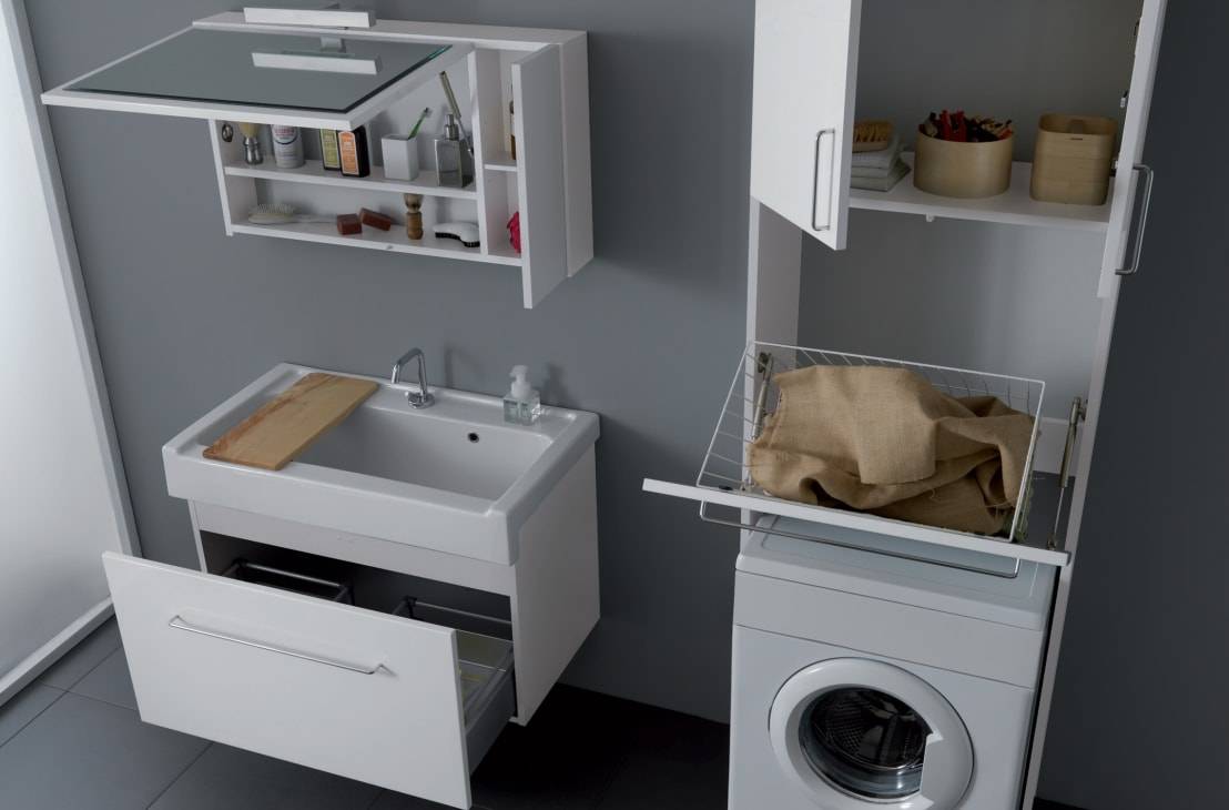Широко в этом случае используется и прием высоты стены. Для этого потребуется установить под машинкой шкаф, который сможете использовать для хранения моющих средств или полотенец, а на его поверхность установить стиральную машинку.