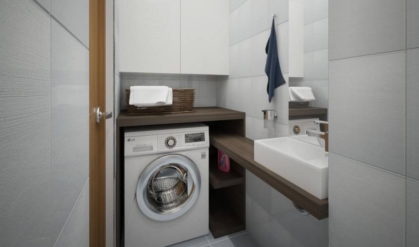 Несмотря на то, что большое количество жилья уже построено по современным требованиям, все равно сохраняется тенденция на совмещенные санузлы. Площадь у такого помещения большая, поэтому тут, скорее всего не возникнет проблем в установкой. Если сделать над машинкой своеобразную столешницу, то ее можно будет использовать в качестве гладильной доски.